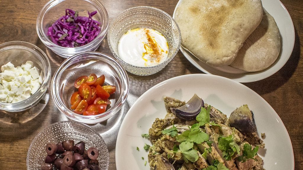 Oikea shawarma-kebab kypsentyy tietenkin vartaassa. Tässä marinoitu kana kypsennetään kuumassa uunissa. Olennaisen rakenteellisen seikan tekee pitaleipä. Herkullisimman version saat, kun leivot pitan itse. Yksi versio on ostaa lähi-itämaisesta kaupasta aitoja leipiä. Hätäpäissään voit turvautua myös suuriin tortillalättyihin. Voit täyttää pitan tai rullata lätyn. Mitä loistavinta illanviettosafkaa perheen ja ystävien kanssa! Ja helppoa. Laita kana edellisenä iltana tai aamulla marinadiin ja ruoka on höysteiden pilkkomista ja kanan kypsennystä vaille valmis.