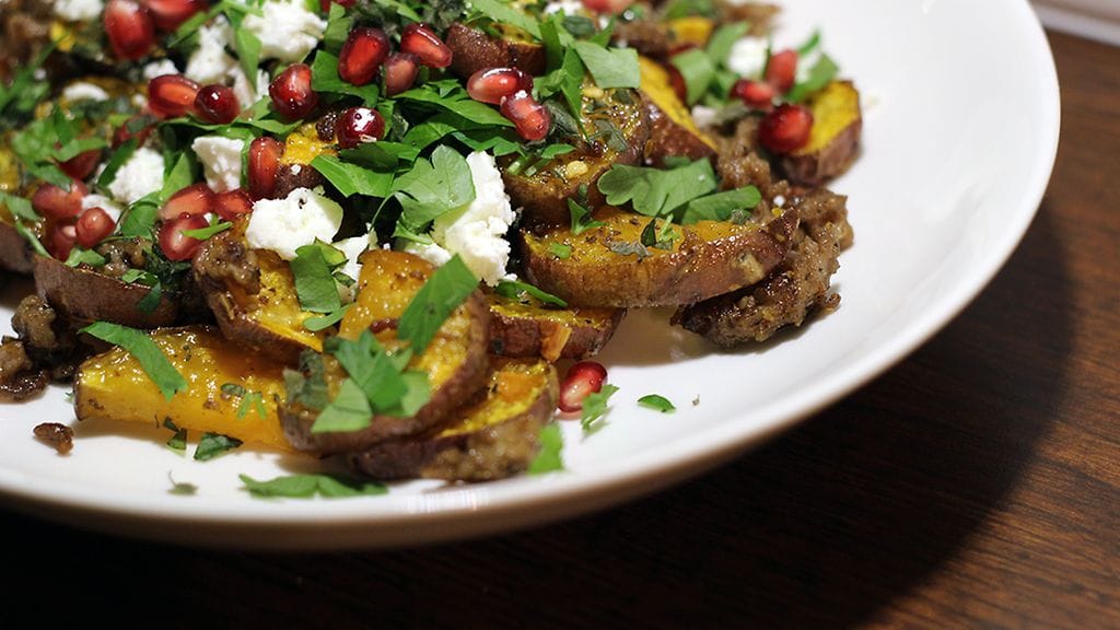 Testasin ensimmäisenä takuuvarmaa lohturuokasuosikkia, Mausteista karitsaa paahdetulla bataatilla. Yksinkertainen, mutta hienoja syviä makuja sisältävä herkku, joka toimisi loistavasti myös meze-pöydässä. Tämä uppoaa taatusti koko perheelle, vaikka esim. granaattiomena uusi tuttavuus olisikin. Tällä hetkellä ei ole niiden sesonki, joten kokeile korvata se karpaloilla! Laitoin ruokaan 400 g karitsan jauhelihaa eikä siitä tullut lainkaan turhan lihaisa. Kirjan ohjeessa oli lihaa 200 grammaa. Bataatin voi näin syksyllä korvata myskikurpitsalla (butternut squash).
