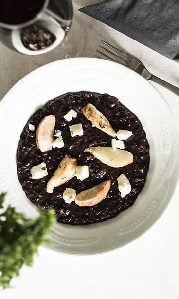 Makea päärynä kohtaa suolaisen gorgonzolan dramaattisen mustalla riisipedillä.