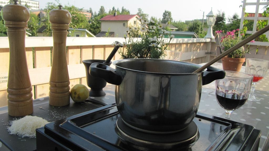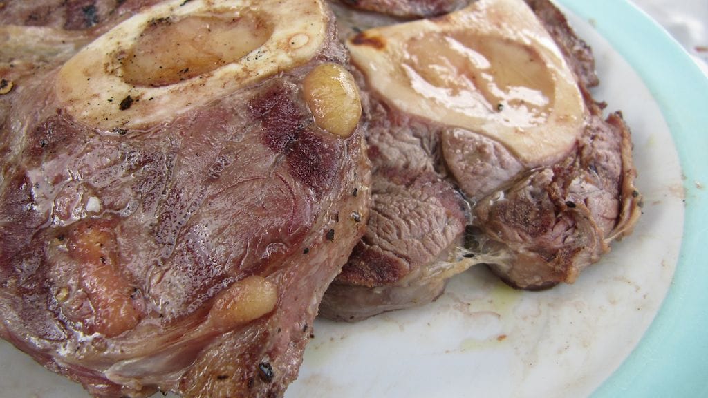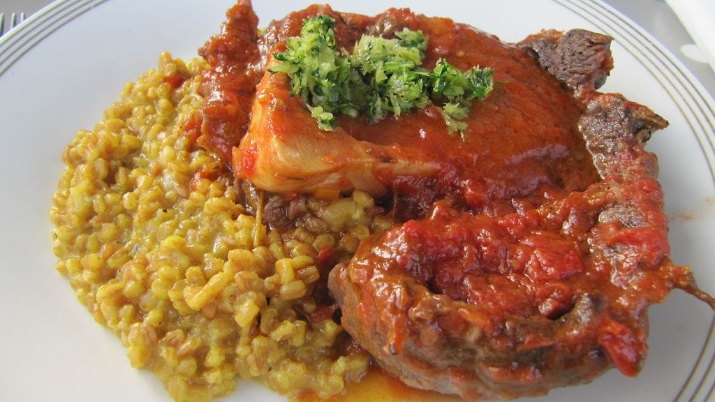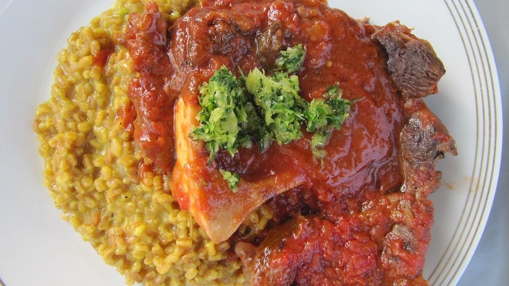 Osso buco on varsin edullinen liha, mikäli teet sen naudasta (alle kympin kilo). Oikeaoppisesti vasikasta kokattuna hiukan kalliimpi. Edullinen liha vaatii aikaa mureutuakseen. Hauduta sitä ainakin 2,5 h lihan laadusta riippuen. Kruunasin potkan gremolata-tahnalla. Luun sisällä oleva luuydin on monille suurta herkkua. Sen voi lipaista vaikkapa leipäpalan päälle makupalaksi. Itse en tällä kertaa leivittänyt lihaa vehnäjauhoissa, vaan grillasin syyt kiinni ja laitoin sitten pataan. Pieni savuaromi on aina hyvästä. Risotto alla milaneseen käytin riisin sijaan tapani mukaan emmervehnää.