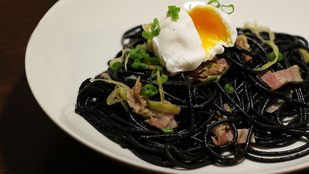 Pasta Carbonara mustalla spaghetilla ja uppomunalla