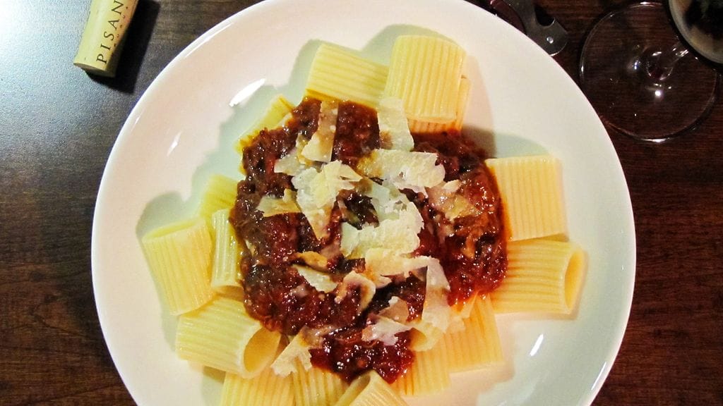 Olennaista on käyttää halpoja ruhon osia. Paisti ja fileet vain sitkistyvät ja kuivuvat eivätkä maistu miltään. Nyrkkisääntönä voi pitää jälleen kympin kilohintaa. Sen yli ei saa mennä. Lapa, rinta ja kylki ovat loistavia valintoja. Lisäksi mukaan sujahtaa raakamakkaroita. Periaatteessa soosiin voi käyttää minkälaisia "huonoja" lihanpalasia vain, mitä sattuu kaapista löytymään. Nautaa, possua, lammasta, kanaa, kania, riistaa… Voit vaikka tehdä pieniä lihapullia ja käyttää kastikkeen osana. Tämä versio on rustiikkinen ja napolilaisen henkinen. Bolognalaiseen ragúun käytetään jauhelihaa. Tähän käytän punaviiniä, mutta bologneseen valkoista. Makkarat voi käyttää kokonaisina tai palleroiksi kuoresta pois puristettuina.