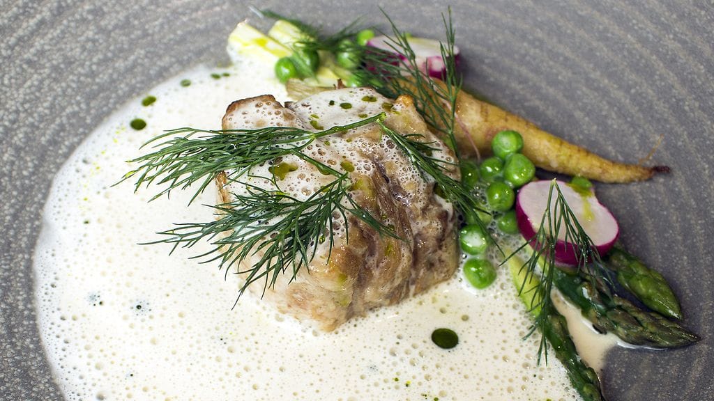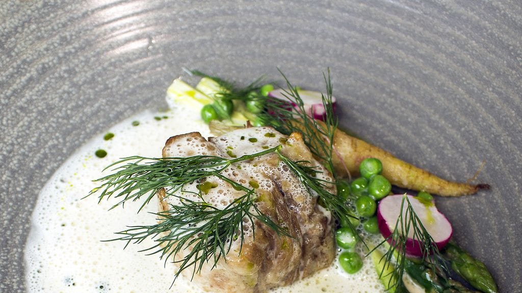 Valitsemme kolmen ruokalajin menut. Vaimolle vegeversio, minulle Menu Kesäpäivä (44 eur, 4 annoksella 48 eur). Jos olisin tajunnut, olisin kuskina ottanut viinimenun puolikkaana kuten naapuripöydässä. Saksalainen Pauly Bergweiler Feinherb-Riesling toimii kuitenkin yllättävän hyvin läpi aterian. Hitusen jyräten alkuruokaa, mutta riittäen pääruoalle.