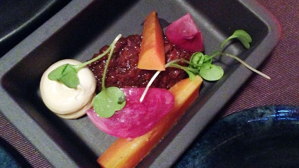 Yllättävän virkeästä mielialasta huolimatta en ollut lainkaan analysointituulella ruoan suhteen. Olin ollut sitä koko viikon. Halusin vain hyvää syötävää. Juuren sapasvalikoima (13,5 eur/hlö) oli siihen kuin mittatilaustyö. Näitä suomalaisia pikkuherkkuja kärrättiinkin pöytä täyteen. Ihan vain alkupaloiksi. Erittelemättä nyansseja vajaasta kymmenestä suupalasta, nousee päällimmäiseksi mieleen annosten tasalaatuisuus. Yksikään ei onnu, ei tosin häikäisekään. Kaikki ihan vain pirun hyviä. Tyytyväisyys hiipii mieleen. Juuri teki sen taas. Kun on päässyt luottoraflan asemaan, voi muuttuva suunta olla melkeinpä vain alaspäin. Status säilyy.