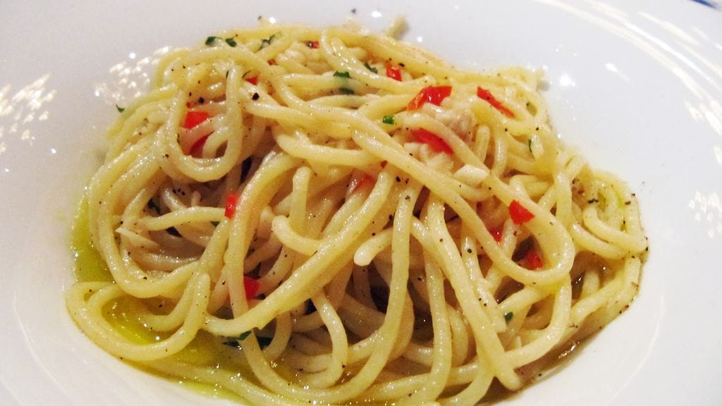 Tilaan alkuun ravioleja täytettynä Robiola-juustolla ja perunalla rosmariinilla maustetun voikastikkeen kera. Näen jo pintapuolisesti, että annos on aitoa Italiaa. Pasta ui voissa ja vähempikin olisi riittänyt, mutta se on saapasmaassa yleistä. Pastan kypsyys on täydellinen ja maku täyteläinen olematta tunkkainen. Rasvapommi, jota voisi hotkia turhan paljon, jos saisi mahdollisuuden. Vaimo testaa keittiön klassikolla. Spaghetti aglio olio e peperoncino eli valkosipuli-oliiviöljy-chili -pasta. Kestää vertailun Italian paikkoihin. Voi, kunpa Tampereeltakin saisi tällaista pastaa!