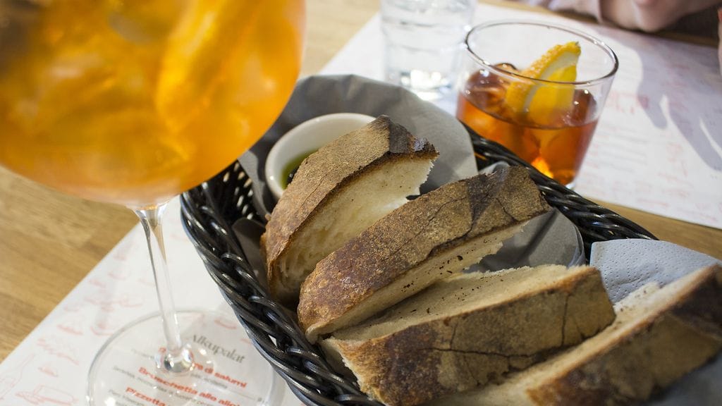 Saimme kutsun tulla maistelemaan uutta tyyliä heti avajaispäivänä. Alkajaisiksi ehdotetaan aperitiiviksi Lucan suosikkeja, Aperol Spritziä ja Negronia. Kappas, samat suosikit kuin meillä. Luca ehdottaa alkupaloiksi napolilaista fritattua pizzaa sekä bruschettaa. Ensin pöytään jumalaisen rapeakuorista leipää oliiviöljyllä.