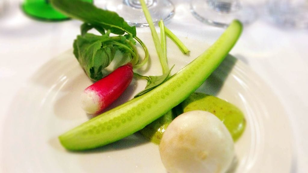 Alkuruokana eteemme tuodaan keväisiä vihanneksia, jotka olivat realiteetit huomioiden osittain kärrätty ulkomailta. Retiisiä, naurista ja kurkkua dipattiin villiruusu-tillimajoneesiin. Yksinkertaisen kikkailematonta, mutta näin keväällä kesän maukkaita ensipuraisuja. Dippi antoi viitettä sille, mitä tuleman piti. Ei makunystyröitä räjäyttäviä makuja, mutta uutuudessaan kaikkea muuta kuin aiemmin maistellut. Illallisen viinit olivat Ranska-painotteisia ja vähintäänkin luomuja ellei jopa vanhoja perinteitä kunnioittavia aitoviinejä. Napakoita osumia ruoan kanssa. Viinit näkyvät alimmaisessa kuvassa.