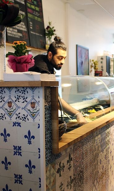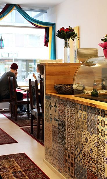 Lautasilta sekä sisustuksesta huokui ennen kaikkea raikkaus. Kaikki kasvikset olivat tuoreita ja jopa avokado vihreää. Mietin alkuun, kuinka paljon ruoasta tulee pakastimesta ja valmispurkeista, mutta maistettuani kaikkea, totesin kokonaisuuden erinomaiseksi enkä vaivannut päätäni ja ruokakokemusta enempää. Täytyy silti selvittää myöhemmin ihan mielenkiinnosta. ”Arat paikat” olivat joka tapauksessa tehty itse ja tuoreus määritti kokonaisuutta. Tabbouleh oli parempaa ja raikkaampaa kuin mitä olen itse onnistunut tekemään. Tahnat maukkaita ja sopivasti toisistaan poikkeavia. Pelkästään niistä koostuva annos toimisi leivän kera rentoon istuskeluun ja rupatteluun.