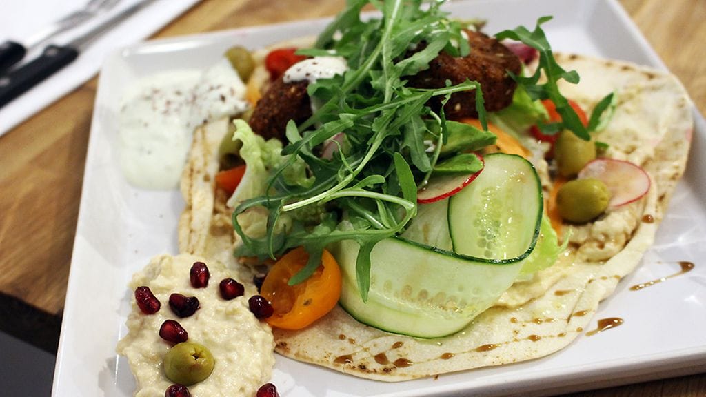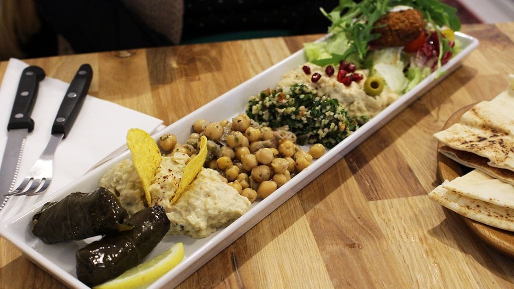 Valitsimme yhden falafel-annoksen ja yhden meze-lautasen. Lebanon-leipä (9,10) sisälsi pari falafel-pullaa, hummusta, salaattia, avocadoa, oliiveja ja avocadojogurttia. Paikan nimikko-mezet (9,60) kattoivat falafeleja, hummusta, tabbouleh-salaattia, baba ganoush -tahnaa, viinilehtikääryleitä sekä marinoituja kikherneitä.