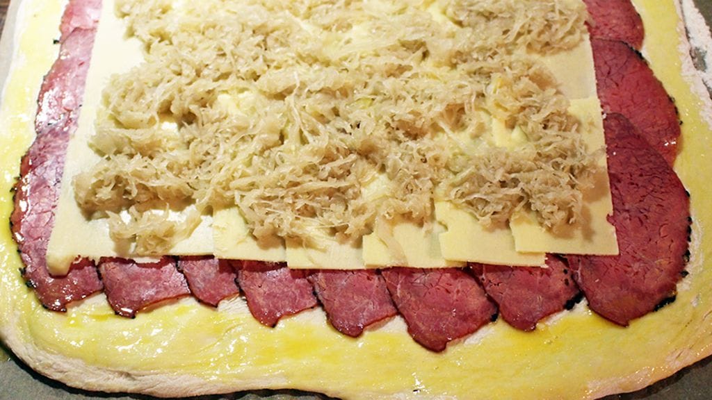 Reuben Sandwich on jenkkiklassikko omassa sänkkärisarjassaan. Leivän väliin pastramia, emmentalia ja hapankaalia sekä mausteista, majoneesipohjaista ”venäläistä kastiketta”. Anna itsellesi hetki miettiä tuota komboa. … Noin. Tulee väistämättä hiuko. Kun tuohon heittää vielä sanan pizza, pitäisi kuolan jo valua. Heitin leipätäytteet amerikanitalialaishenkisen stromboli-pizzarullan väliin ja dippailin soosiin. Uuuuh, mama!
