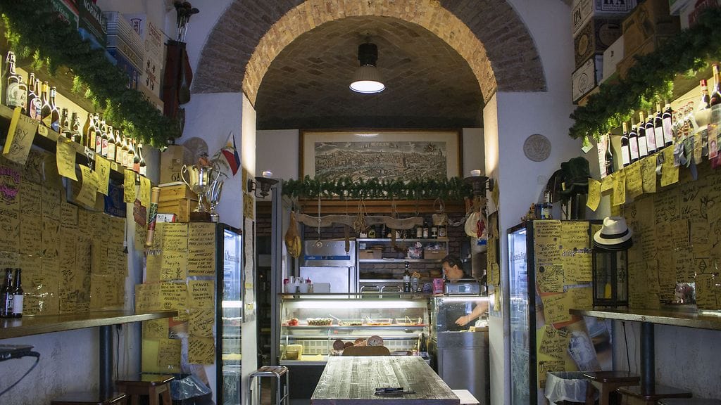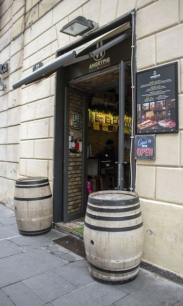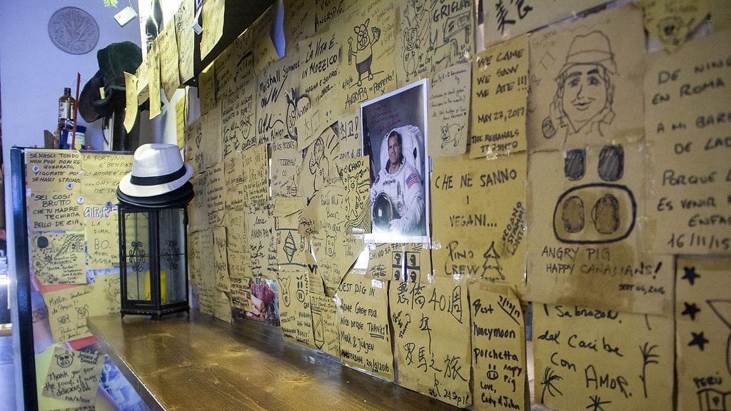 Syötyäni loistavan pizza al taglion Pizzarium Boncissa kävelin muutaman sata metriä ja totesin haluavani lisää syötävää. Olin kysellyt Facebookissa lukijoilta raflavinkkejä ja jonkun tipsistä olin laittanut kartalle pinnauksen Angrypigistä, joka sijaitsi lähistöllä. Googlasin ja huomasin sen olevan porchetta- ja olutbaari. Olisittepa nähneet ilmeeni. En asettanut kovia ruokatavoitteita Rooman-reissuun, mutta tasokas porchetta oli yksi niistä. Pizzan ja puolenpäivän ohituksen jälkeen teki bisseäkin mieli. Magnifico!