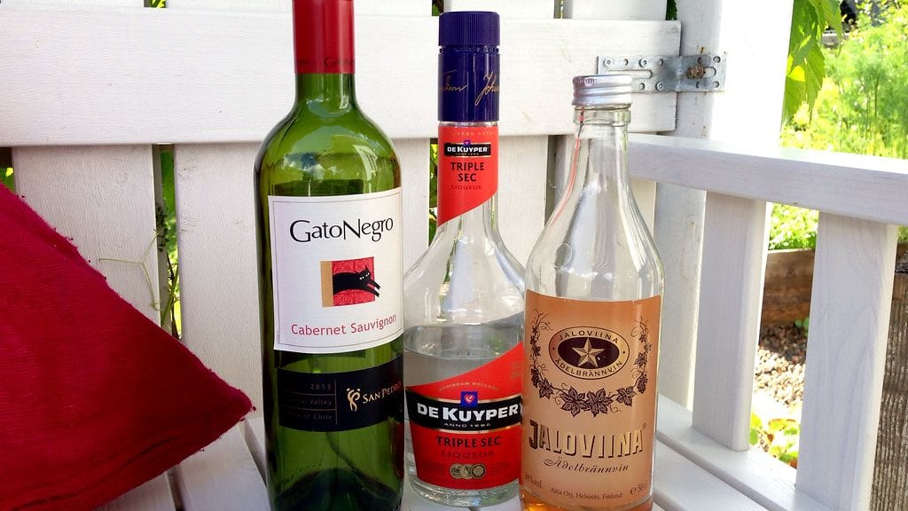 KERRO OMA SANGRIA-RESEPTISI! Sangriaa voi tehdä hyvin monimuotoisesti, joten kerro ihmeessä omat vinkkisi kommenteissa. Saat toki myös arvostella omia valintojani. Ne valikoituivat puhtaasti viinakaapin sisällön pohjalta (huomaa Jallu-pullon väärä korkki). Mutta kuten totesin, oikein onnistunut liemi siitä syntyi.