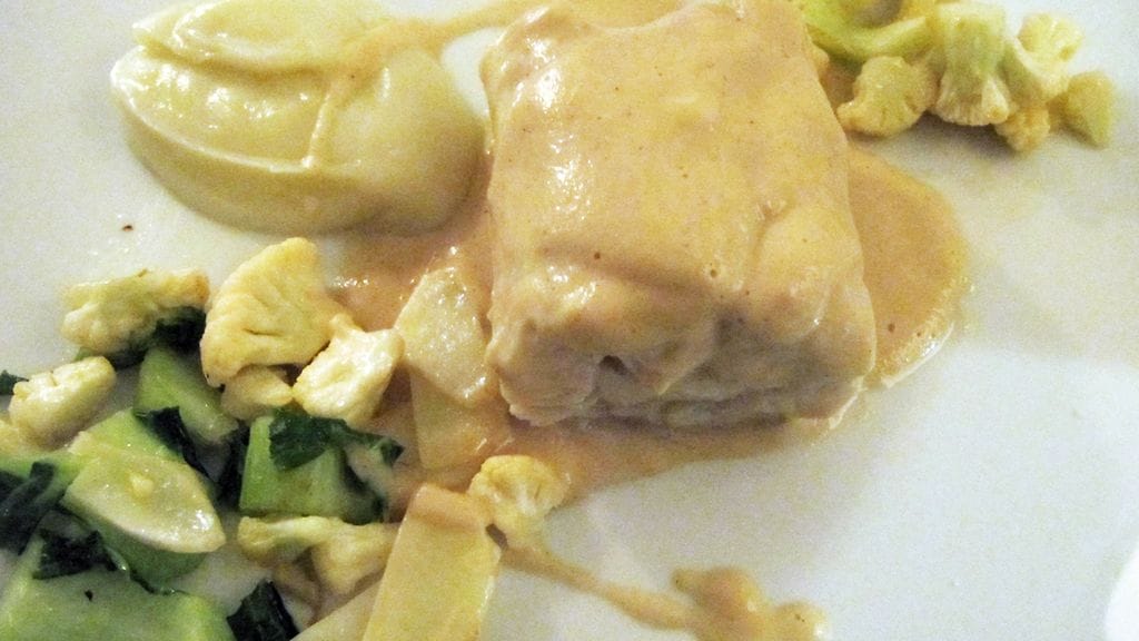 Menuja oli tarjolla kaksi ja otimme luonnollisesti ne molemmat suositusviinipakettien kruunaamana. Alkuun meille tuotiin keittiöntervehdyksenä maa-artisokkaa keiton ja sipsin muodossa. Loistava makunystyröiden avaaja! Juuressipsit ovat suurta herkkuani ja samettisen kuohkea keitto pinnoitti suun ja sai vaatimaan lisää. Alkuruoaksi sain Savukalaa ja selleriä. Lämminsavustetut kalat eivät ole päässeet vielä kalaan siedätyshoidossani mukavuusalueelle asti, mutta kuten laadukkaissa rafloissa olen huomannut, osaa taitava kokki valmistaa jokaisesta raaka-aineesta jotain makurajoitteiden ylittävää. Niin nytkin. Koko menun parhaaksi osaksi ilmentynyt, upea annos tarjoili lepällä savustettua särkeä, omenapuulla ja fenkolinsiemenillä savustettua haukea sekä katajasavussa kypsynyttä lahnaa. Tasapainottajana toimi juuriselleri savupyreenä ja appelsiinisena majoneesisalaattina. Uusia makuja, jotka tekevät oikeutta useiden roskakaloina pitämille onkisaaliille. Muutama tällainen lisää ja makuvinoutumani olisi korjattu!