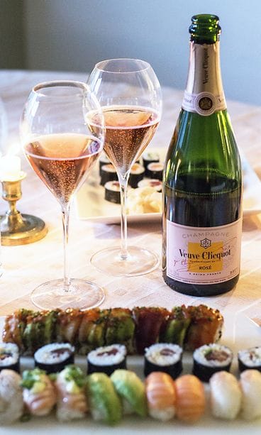 Koska arkiruoka kuluu pitkälti oman kokkailun merkeissä, juhlimme merkkipäivää nouto-susheilla. Siten perjantai-ilta ei painottuisi kokkailuun. Olin saanut näytepullon 200-vuotiasta taivaltaan juhlivasta roseeshampanjasta, Veuve Clicquot Rosé Champagne Brutista, jolle halusin tehdä sushien kylkeen vielä oman spesiaalin makupalan. Raikkaan täyteläinen shampanja toimii ruokapöydässä monipuolisesti keskivahvan makupaletin tasolla. Carpacciota, ankkaa, tonnikalaa ja semmoista. Nyt särvingiksi Tomi Björckin ohjeen mukaan siika-sashimia wasabi-kastikkeella. Erinomainen kombo.