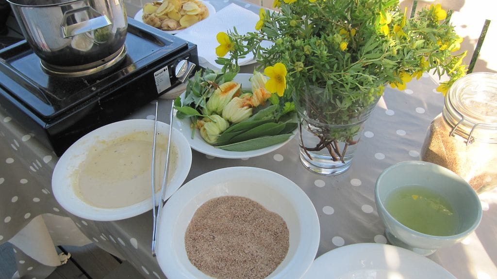 Tarvitset esim. kesäkurpitsan kukkia, lehtiä ja viipaleita, lipstikan lehtiä, salvian lehtiä, anjovista, kukkakaalia jne. Arancineihin tarvitset risoton tähteitä, kananmunaa ja korppujauhoja sekä täytettä.
