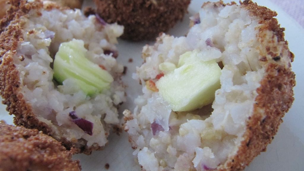Kokkasin edellisenä päivänä täytettyjä paprikoita. Niiden riisitäytettä jäi yli ja siitä arancineja (resepti). Sisään työnsin kesäkurpitsan palasen. Perus korppujauhojen puuttuessa pyöräytin palleroiset ruiskorppujauhoissa. Oikein mainioita. Arancinit voit täyttää ragùlla, makkaralla, juustolla (esim. mozzarella tai ricotta) ja kasviksilla.