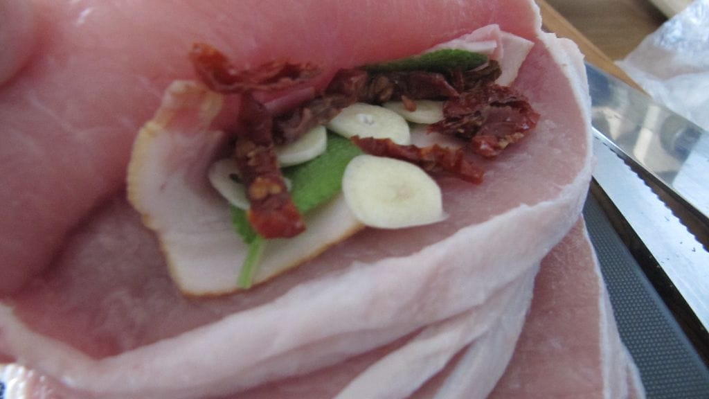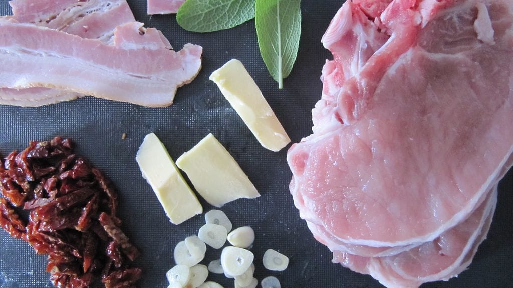 Kasvimaa alkaa tuottaa jo hyvää vauhtia satoa ja ajattelin jakaa vinkkejä keittiöpuutarhan antimien käyttöön. Salvia on monille hiukan vieras kokattava, joten aloitan sillä. Viime vuonna hukuimme salviaan, mutta tänä vuonna taimena istutettu yrtti tarjoilee herkkulehtiään varsin niukalti. Ehkäpä se heinäkuun lämmössä innostuu. Käytin ensimmäiset liikenevät lehdet täytettyihin ja grillattuihin porsaankyljyksiin. Sisään meni myös pekonia mehevyyttä ja makua antamaan sekä aurinkokuivattua tomaattia ja valkosipulia. Kuivumista ehkäisin voinokareella. Paksuja kyljyksiä on turhan harvoin tarjolla, mutta ainahan voi pyytää lihakauppiasta leikkaamaan sellaisia. Pääasia, että kyljykset ovat sen verran tuhteja, että pystyt leikkaamaan niihin taskut.