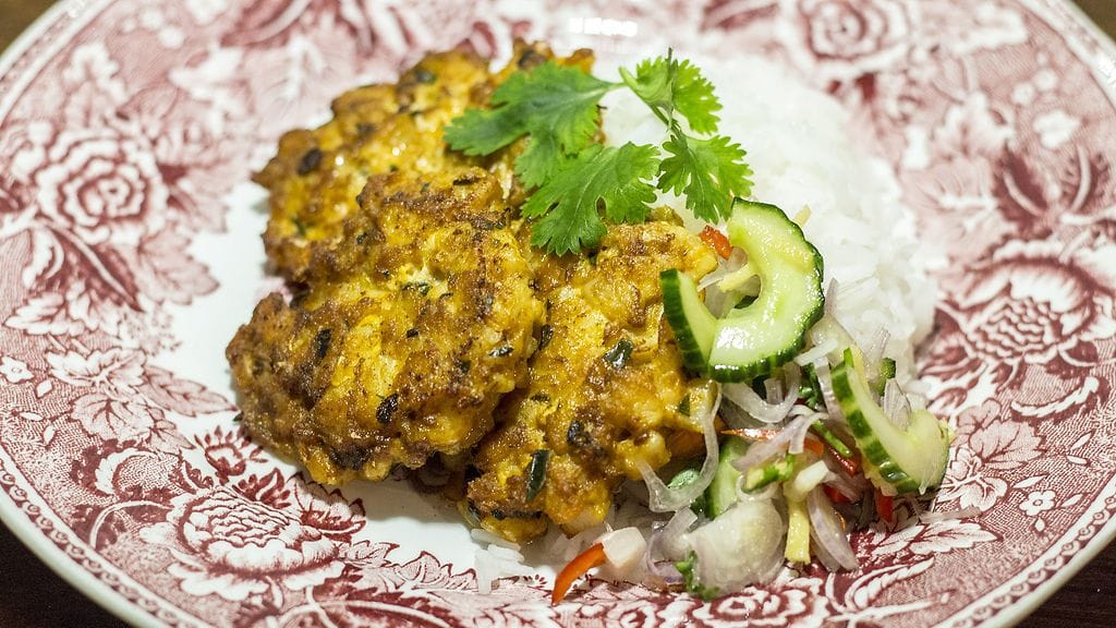 Halkaise kurkku pitkittäin. Kaavi teelusikalla kurkun kostea keskiosa pois. Leikkaa kurkku ohuiksi siivuiksi. Sekoita siivut yhteen salottisipulisiivujen, inkivääri- ja chilitikkujen ja korianterin kanssa. Sekoita mukaan etikkaliemi. Laita odottamaan muuta ruokaa. Voit pilkkoa kalan hyvin hienoksi tai surauttaa sen tahnamaiseksi tehosekoittimella. Sekoita yhteen hienonnettu kala, curry-tahna, kananmuna, fish sauce ja tomusokeri. Vaivaa taikinaa paljon, sen verran, että saat siitä jämäkän tahmaisen. Lisää taikinaan kaffir-limen lehtisilppu. Muotoile taikinasta 5 cm levyisiä pihvejä.