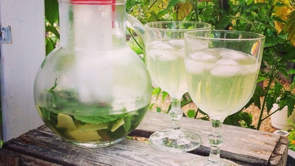 Kuori inkivääri ja leikkaa se ohuenohuiksi siivuiksi. Murskaa mintulehtiä hiukan. Pilko hedelmät. Sekoita ainekset keskenään ja anna tekeytyä vähintään tunti tai vaikka yön yli. Nauti kohtuudella.