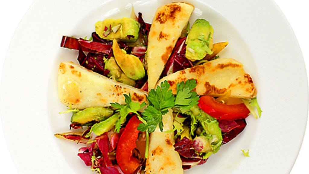 3. Viipaloi halloumi ja jaa mielellään palat vielä viistosti. Sekoita vehnäjauhot ja mustapippuri, paneroi juustoviipaleet seoksessa. Suolaa ei tarvita, juusto itsessään on niin suolainen. Paista viipaleet varoen öljyssä ja asettele salaatin päälle. Koristele paprikasuikalein, tiputtele päälle kastiketta. Tarjoile heti.