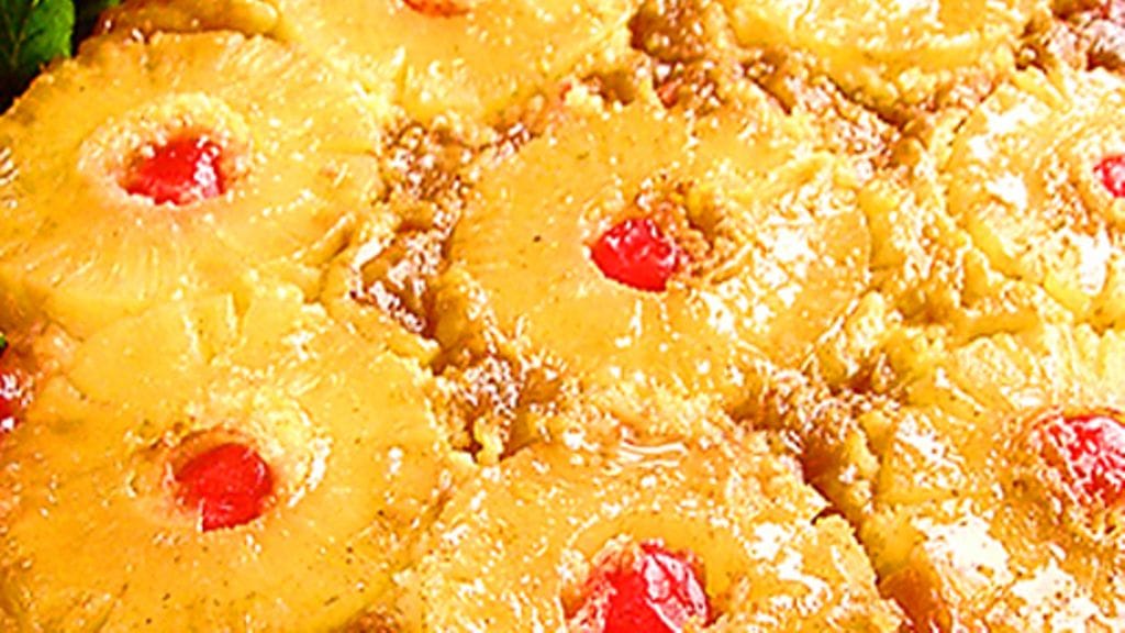 1. Lämmitä uuni 200 asteeseen. Sulata 25 g voita kakkuvuoan pohjalle ja levitä se kauttaaltaan. Ripottele päälle fariinisokeri. Asettele ananasrenkaat vuoan pohjalle ja laita kirsikat ananasten reikiin ja väleihin.