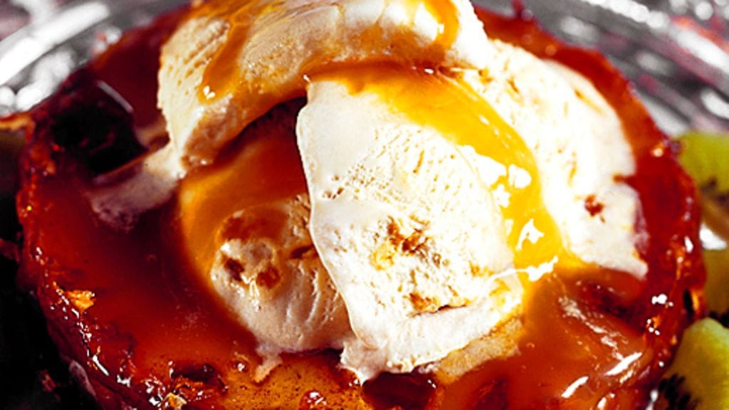 4. Laita päälle jäätelöä ja kastiketta, koristele kiivillä.