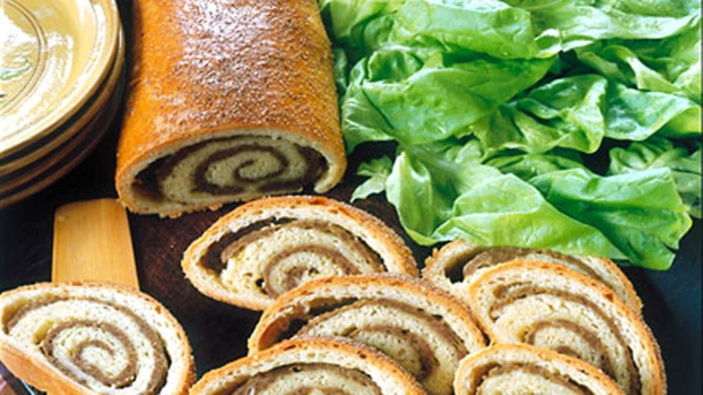 4. Penslaa rulla vatkatulla munalla ja paista se aivan uunin keskitason alapuolella noin 45 minuuttia. Peitä foliolla loppupuolella, jos on tarpeen. Leikkaa kääryle jäähtyneenä viipaleiksi.