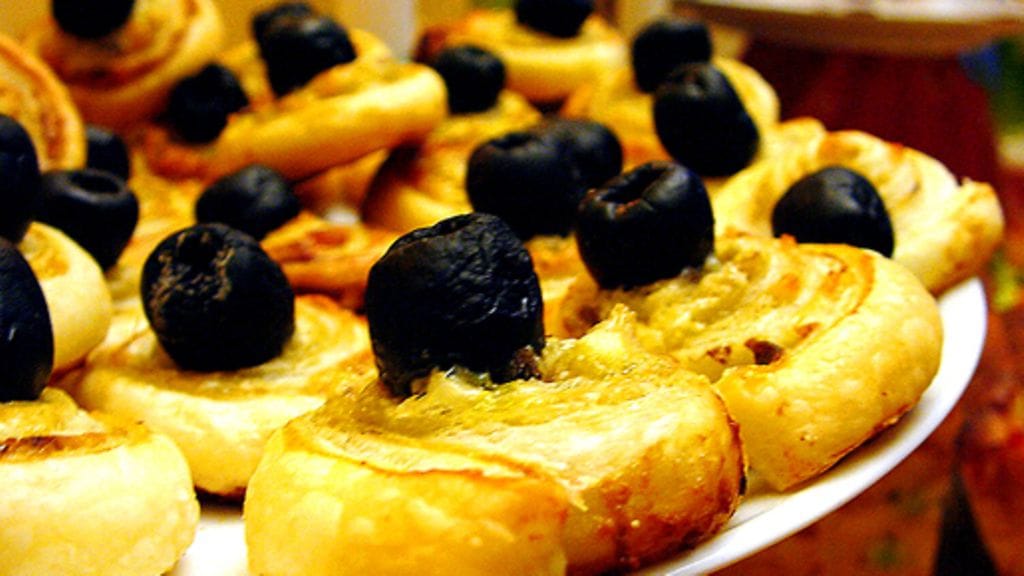3. Leikkaa rulla 50 viipaleeksi. Laita viipaleet leivinpaperille pellille. Halkaise oliivit ja koristele jokainen rullapala yhdellä oliivipalalla. Paista uunissa 6 minuuttia kunnes rullat ovat kauniin kullanruskeita.