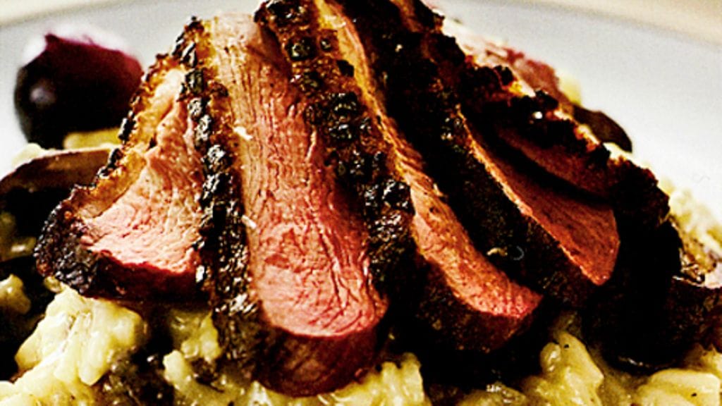 1. Kuumenna uuni 150 asteeseen. Puhdista ankanrinnoista jänteet ja liika rasva. Leikkaa nahkaan viiltoja ruudukoksi. Laita ankanrinnat kylmään paistinpannuun nahkapuoli alaspäin, kuumenna pannu keskilämpöiseksi. Paista lihoja nahkapuolelta 6-8 minuuttia ja kaada pois rasva pannusta sitä mukaa kun sitä kertyy. Käännä ankanrinnat ja paista vielä 2 minuuttia. Laita ne uuninkestävään vuokaan ja mausta suolalla ja pippurilla joka puolelta. Paista uunissa kunnes sisälämpötila on 56 astetta. Ota lihat uunista ja anna jälkipaistua huoneenlämmössä.