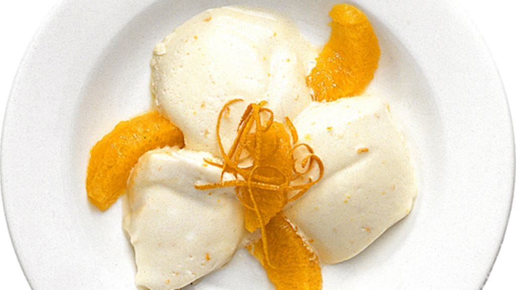 1. Pese appelsiinit, purista kaksi appelsiinia mehuksi ja raasta niiden kuori. Pane liivatelehdet likoamaan kylmään veteen noin 10 minuutin ajaksi ja sulata ne sitten miedolla lämmöllä appelsiinimehutilkassa. Erottele munankeltuaiset ja -valkuaiset. Pane keltuaiset kulhoon ja jätä odottamaan. Vatkaa valkuaiset kovaksi vaahdoksi. Vaahdota kerma.