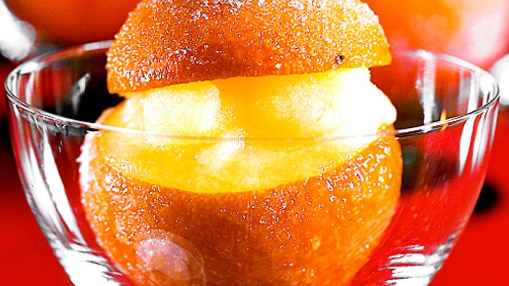 3. Penslaa appelsiininkuoret ulkopuolelta sulatetulla marmeladilla ja kierittele ne sokerissa. Täytä kuoret sorbetilla ja laita taas pakkaseen tarjoiluun asti.