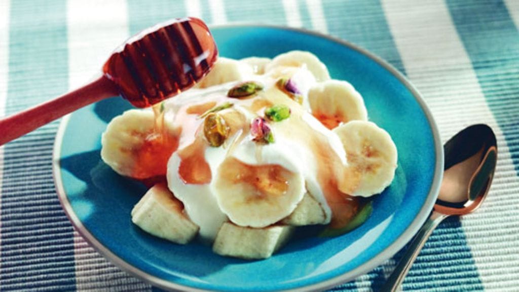 2. Kuori ja viipaloi banaani ja jaa viipaleet kulhoihin. Kaada jogurtti-hunajaseos banaanien päälle.