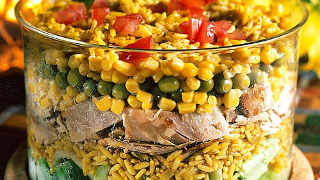 3. Kerrostele selleri, riisi, lämmitetyt broilerinpalat, herneet, maissit ja paprikakuutiot korkeaan vuokaan. Tarjoile mielellään lisäksi lämmintä vaaleaa leipää.