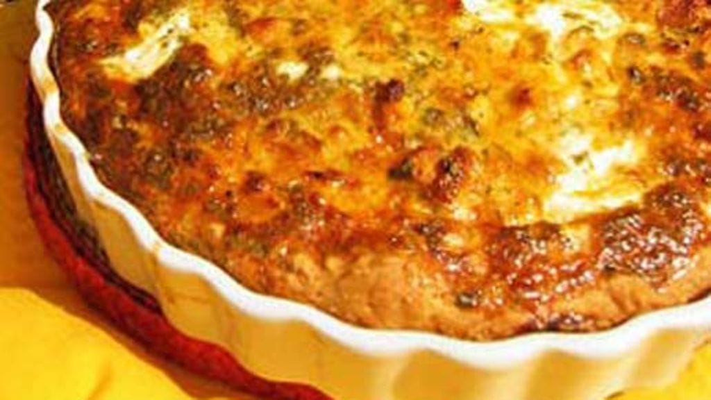 Levitä seos piirakkapohjalle. Sekoita munat ja kermaviili sekä persilja ja juustoraaste ja kaada seos piiraan päälle. Paista 200 asteisen uunin alimmalla ritilällä 30-40 min, kunnes piiras saa kauniin värin.
