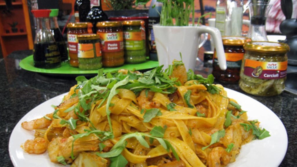 Lämmitä pannu kuumaksi ja lisää siihen tilkka öljyä. Paista sipulia hetki ja lisää katkaravut sekä chili mukaan. Paista kovalla lämmöllä ja lisää lopuksi joukkoon myös latva-artisokat. Sekoita ja kaada pastan joukkoon.