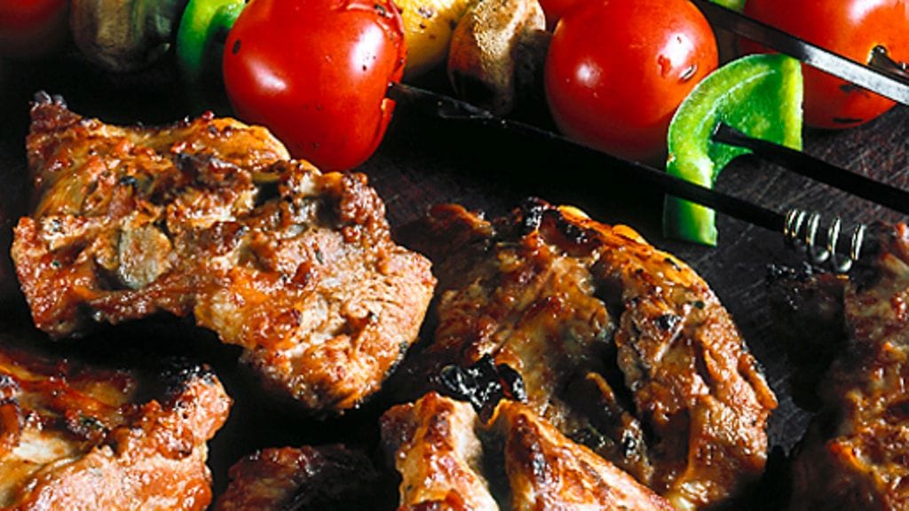 3. Grillaa lihoja hitaasti, penslaa välillä marinadilla ja kääntele moneen kertaan kunnes ribsit ovat läpikypsiä. Kääntele vihannesvartaita hiilloksella n. 10 minuuttia.