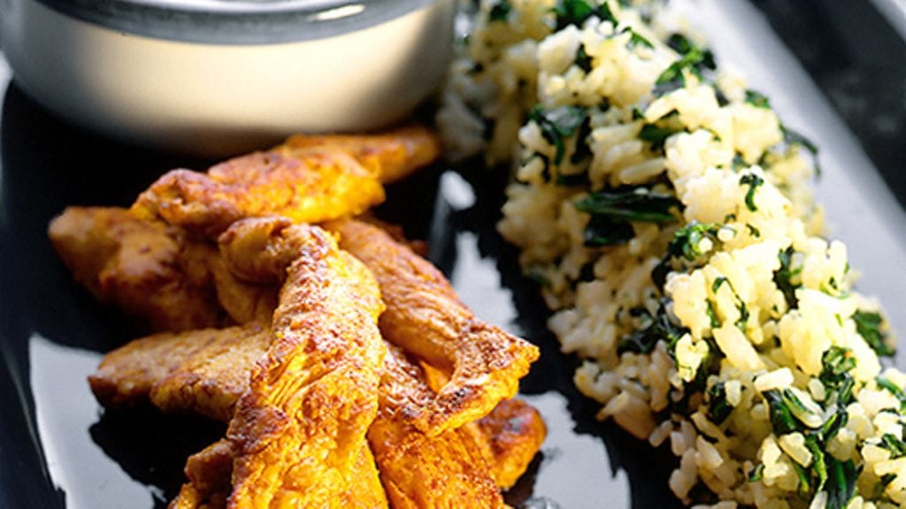 3. Leikkaa broilerifileet suikaleiksi, mausta suolalla, pippurilla, juustokuminalla ja kurkumalla. Paista suikaleet kullanruskeiksi öljyssä. Tarjoile yhdessä pinaattiriisin ja raitan kanssa.