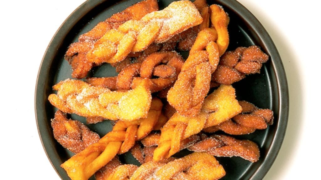 3. Kauli taikina ohueksi levyksi jauhotetulla leivinpöydällä ja leikkaa se pitkulaisiksi 4 cm levyisiksi ja 12 cm pituisiksi paloiksi. Leikkaa kukin pala pitkittäissuunnassa kolmeen osaan niin että osat ovat kuitenkin toisesta päästä yhdessä. Letitä taikinanauhoista pieniä pitkoja. Paina pitkojen päät lopuksi yhteen, niin että ne eivät aukea friteerauksen aikana.