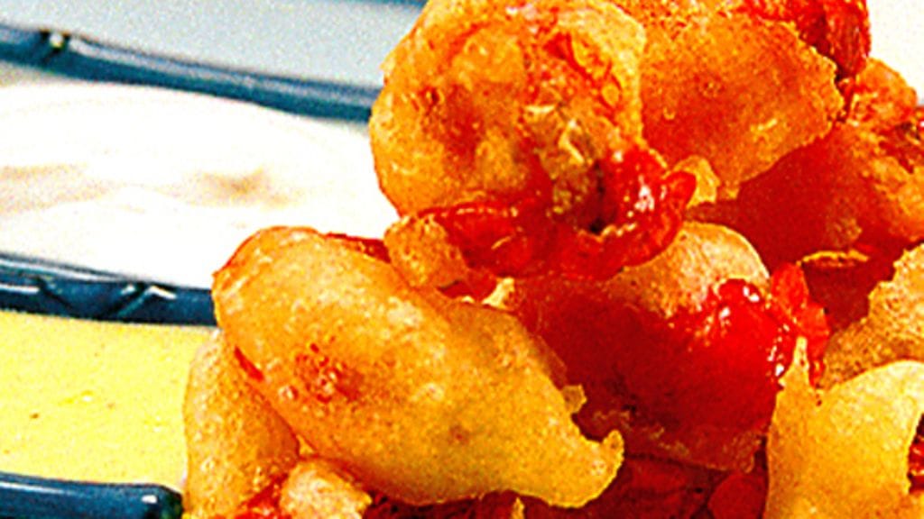 3. Kuumenna friteerauspadassa tai paksupohjaisessa kattilassa öljy 175-asteiseksi. (Digitaalisella lihamittarilla on helppo mitata myös esim. öljyn lämpötila.) Mausta ravunpyrstöt cajunmausteella. Upota pyrstöt yksi kerrallaan frityyritaikinaan ja pane saman tein öljyyn paistumaan. Nosta öljystä reikäkauhalla, kun taikinoidut pyrstöt ovat kullanruskeita. Valuta hetki talouspaperin päällä ja tarjoile heti sherrykastikkeen kanssa.