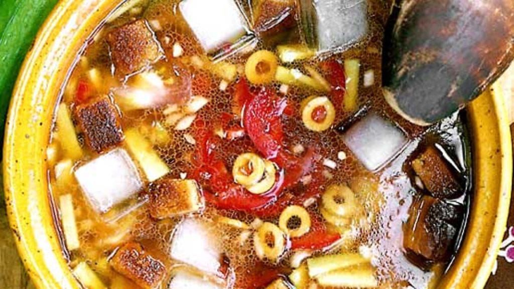 3. Sekoita kaikki vihannekset kulhossa, kaada päälle consommé-tomaattiseos ja mausta. Lisää jääpaloja ja tarjoile.