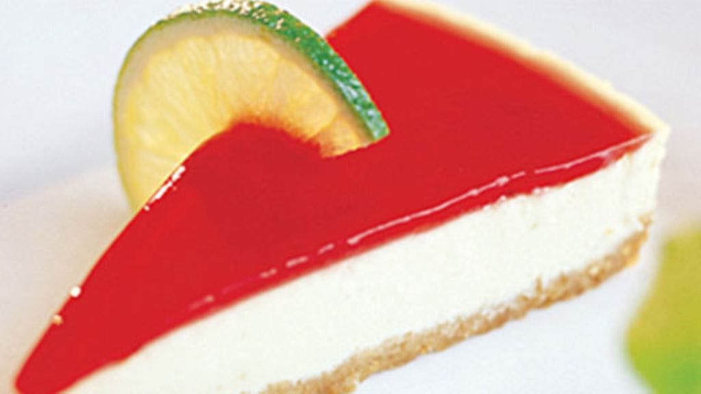 Liota liivatelehtiä 5 minuuttia runsaassa kylmässä vedessä. Anna mansikoiden, veden, sokerin ja limetin mehun kiehua hiljaisella lämmöllä pienessä kattilassa noin 5 minuuttia. Siivilöi pois mansikat ja kaada seos takaisin kattilaan. Nosta liivatelehdet vedestä ja sulata ne lämpimään mansikkaseokseen koko ajan sekoittaen. Jäähdytä seos ennen kuin kaadat sen varovaisesti kakun päälle..