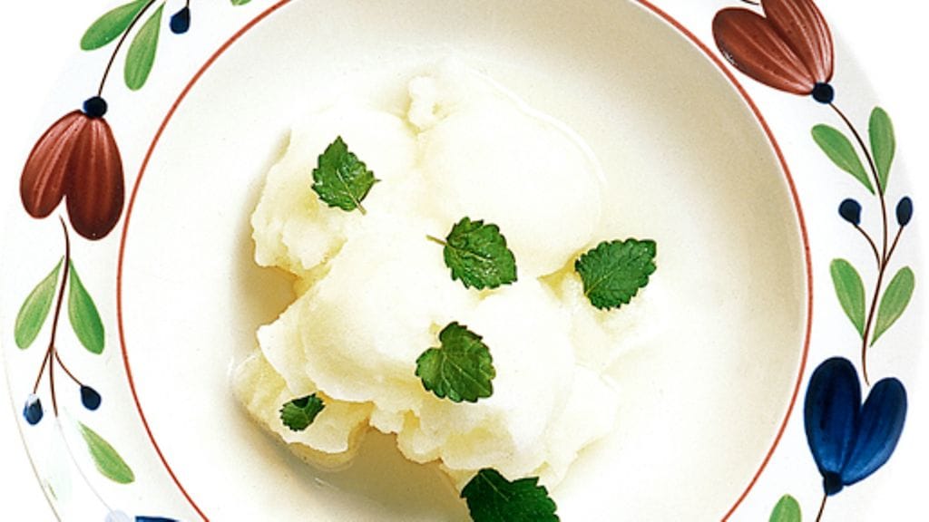 3. Vatkaa valmis sorbetti vielä kerran. Täytä kuorenpuolikkaat sorbetilla. Koristele cocktailkirsikoilla tai sitruunamelissan oksalla.