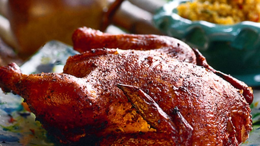 2. Grillaa broileria ympäriinsä. Aloita selkäpuolelta, käännä ja grillaa kyljet ja lopuksi rintapuoli. Penslaa soijaseoksella kauttaaltaan juuri ennen kuin broileri on läpikypsä.