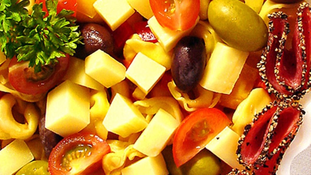 4. Sekoita paprika, tomaatit, oliivit ja juustokuutiot salaattiin. Tarjoile heti, sellaisenaan tai salamiviipaleiden kera. Leipä maistuu hyvältä salaatin kanssa.