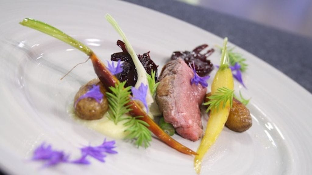 Kuori tarvittaessa juurekset niin, että naatit jäävät näkyviin. Keitä 4 minuuttia suolalla maustetussa vedessä ja jäähdytä nopeasti jäävedessä. Kuori sipulit ja leikkaa keskeltä halki. Hauduta sipulit paistinpannulla voissa, lisää porkkanat ja palsternakat. Mausta juurekset. Koristele kuusenkerkillä.