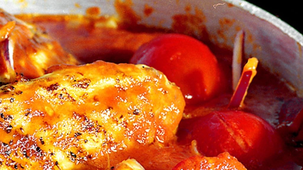1. Leikkaa broileri kahdeksaksi suunnilleen samankokoiseksi palaksi. Kuori ja viipaloi sipuli ja valkosipulinkynnet. Ruskista broilerinpalat niin että ne saavat kauniin värin, mausta suolalla ja pippurilla.