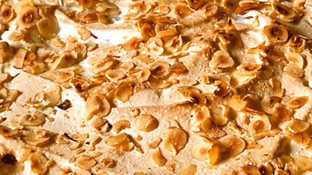 3. Laita kakku pellille. Peitä se keitetyillä hedelmillä ja lusikoi päälle sokeriliemi. Vatkaa valkuaiset kovaksi vaahdoksi, lisää sokeri ja vatkaa paksuksi. Levitä marenki hedelmille, ripottele päälle mantelilastut ja paista valmiiksi uunissa n. 10 minuuttia.