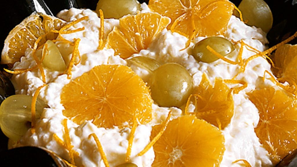 1. Vatkaa kerma ja vaniljasokeri. Sekoita puuron kanssa. Mausta hunajalla. Kääntele mukaan osa hedelmistä ja kaada riisi kulhoon.