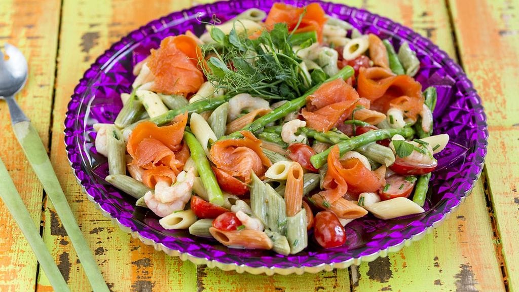 Paloittele kylmäsavulohi ja puolita miniluumutomaatit. Sulata tai valuta katkaravut.