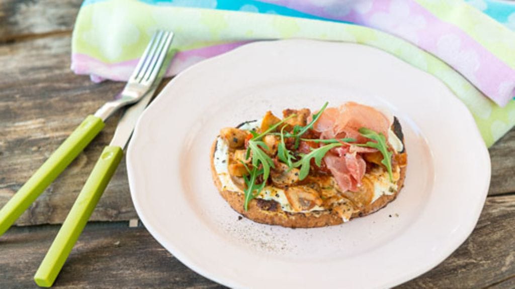 Kaada kerma lautaselle. Riko joukkoon muna ja sekoita rakenne rikki. Kastele leipäviipaleet molemmin puolin seoksessa ja nosta lautaselle. Kuumenna voi pannulla. Paista leipäviipaleet kauniin värisiksi molemmin puolin. Halkaise miniluumutomaatit ja lohko tai halkaise herkkusienet. Hienonna kuoritut valkosipulinkynnet. Lisää ne kuumalle pannulle ja lisää tarvittaessa joukkoon hieman öljyä. Kääntele hetki. Lisää valkosipulituorejuusto ja kuumenna. Sekoita joukkoon persiljasilppu. Jaa seos leipäviipaleiden päälle ja käännä Parmankinkut kääröiksi päälle. Tarjoa heti.